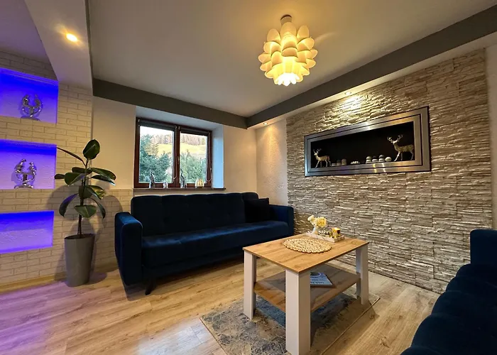Offering guests to unwind in a hot tub, Domek Pluto Konradow Ladek-Zdroj villa is located a 15-minute drive from Czarna Gora Ski Mountain.